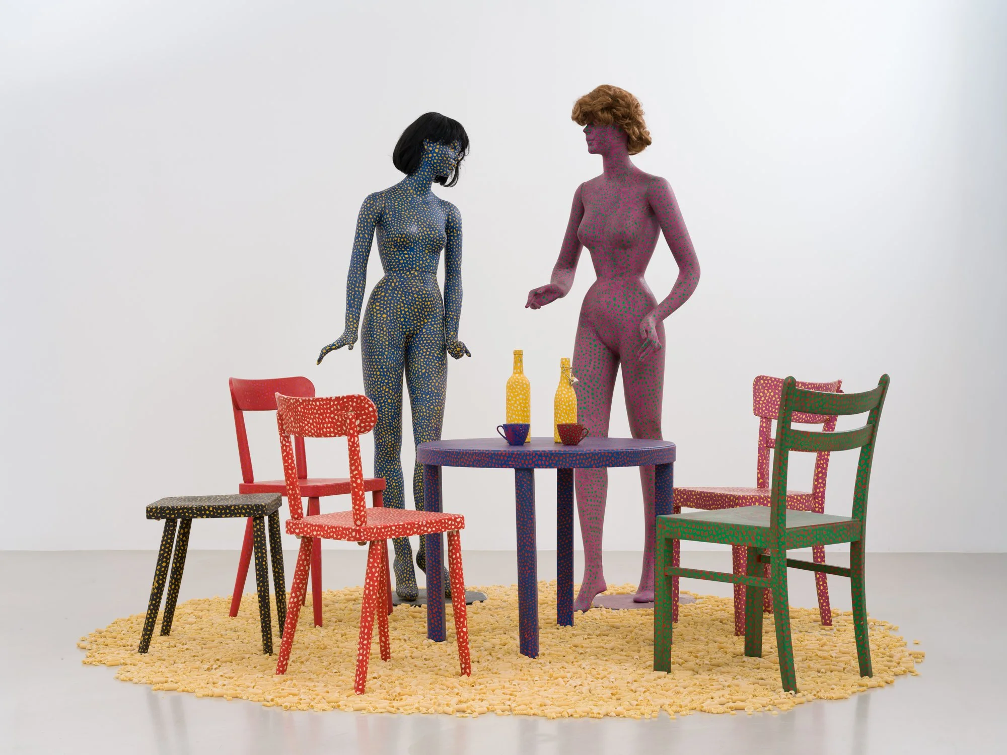 acrylic paint on two polyester mannequins, synthetic wigs, table, five chairs, two pitchers, two teacups, dried pasta