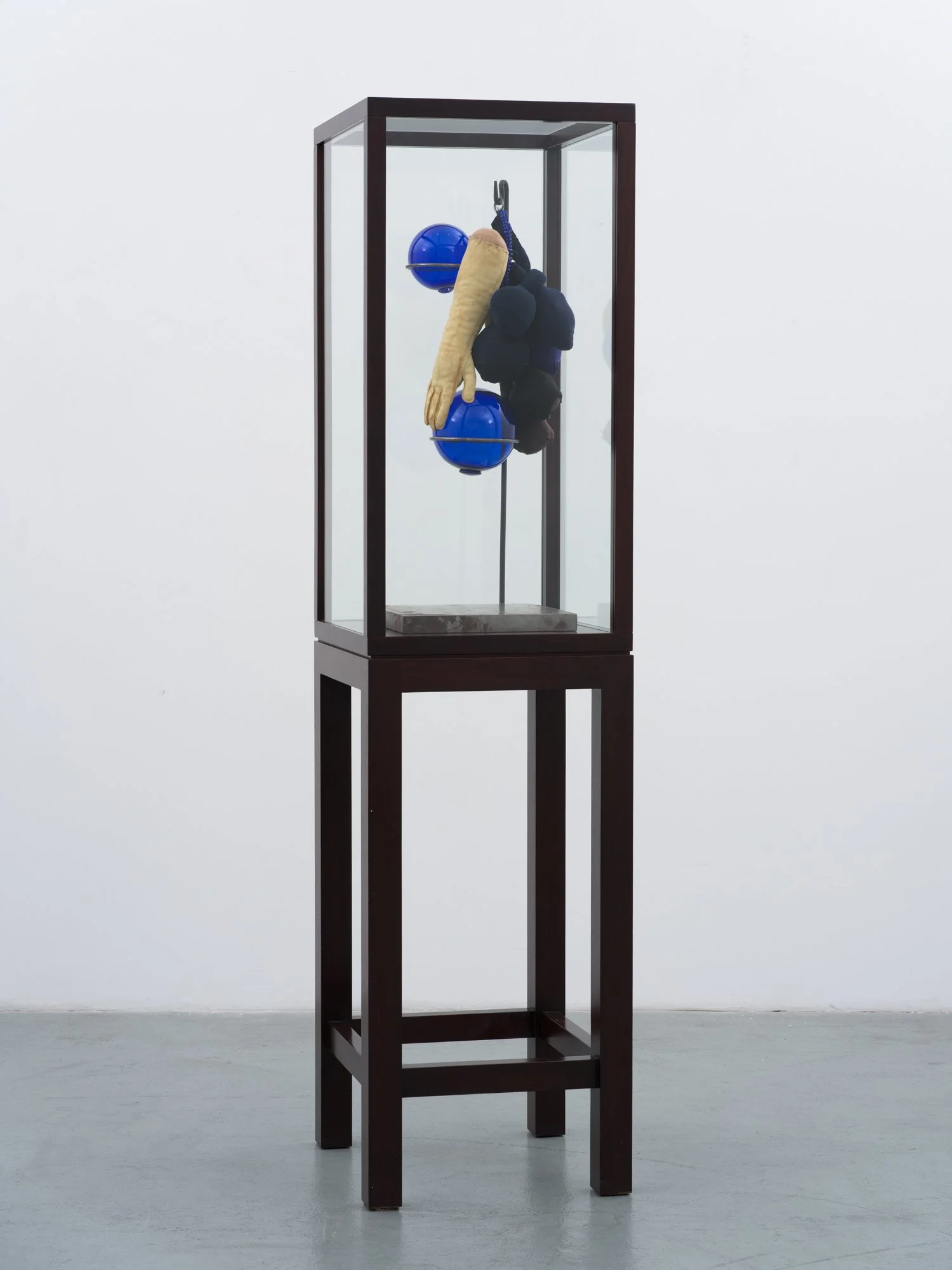 fabric, steel, glass, plastic in wood and glass vitrine